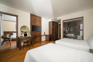Phòng nghỉ tại Golden Lotus Hotel được bố trí khu vực ghế ngồi, TV màn hình phẳng và phòng tắm riêng với máy sấy tóc. Một số phòng còn có ban công. Máy điều hòa và bàn làm việc cũng được trang bị trong mỗi phòng.