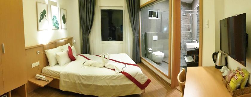 Phòng nghỉ tại MIA Hotel được trang bị TV màn hình phẳng, máy điều hòa và tủ để quần áo.